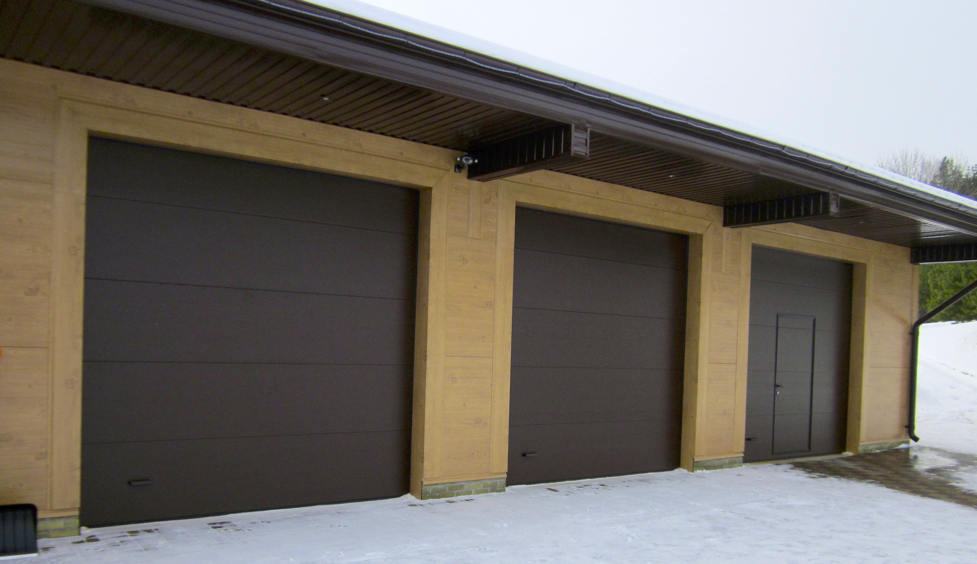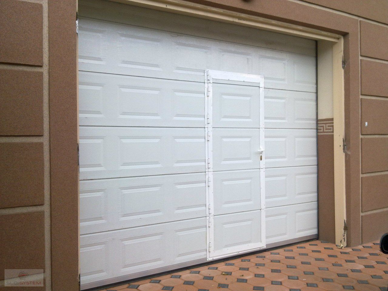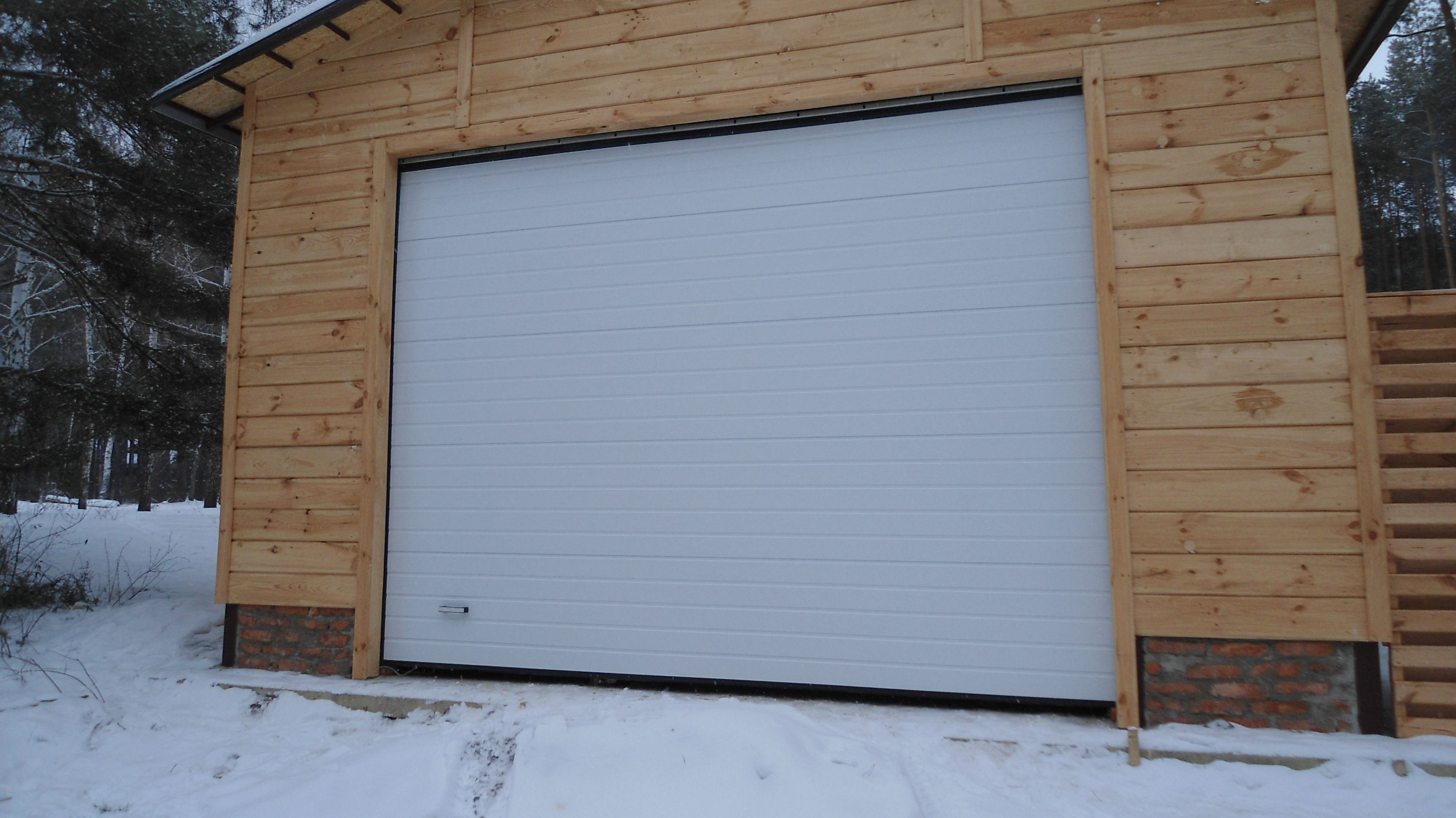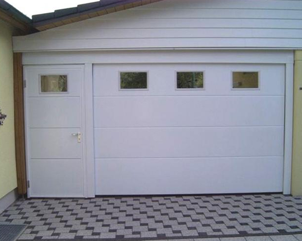 Часто секционные ворота делают с калиткой, если нет отдельного входа в гараж. Без нее не обойтись. Если вдруг будет перебой напряжения или отключат свет, в гараж вы сможете зайти только через калитку, чтобы разблокировать ворота и открыть их вручную.